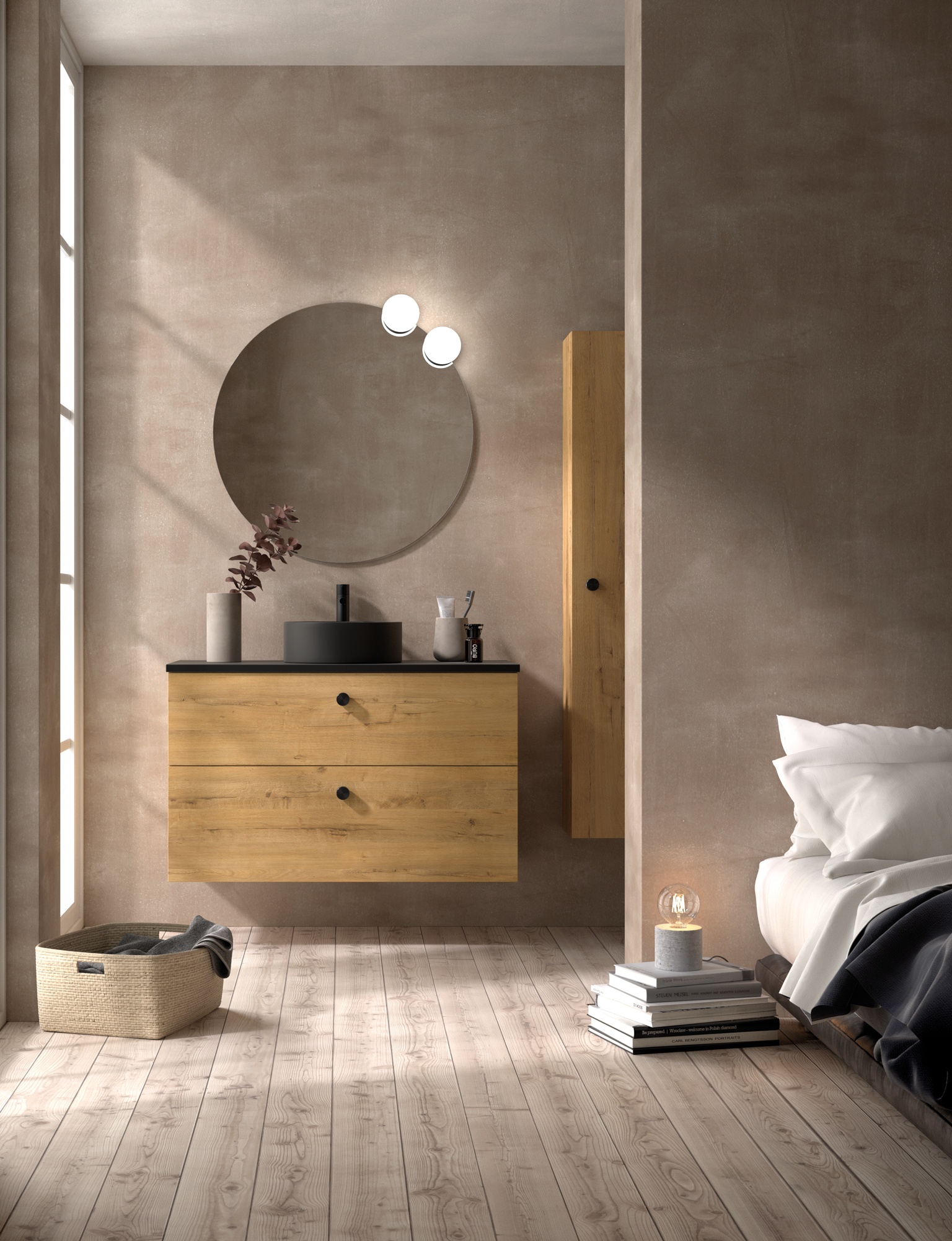 Le meuble LUNA bois naturel avec vasque noire allie élégance, praticité et modernité.