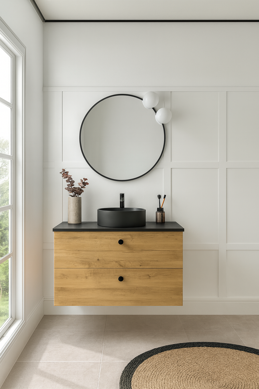 💡 L’alliance parfaite du bois naturel et du noir mat pour une salle de bain tendance et fonctionnelle.